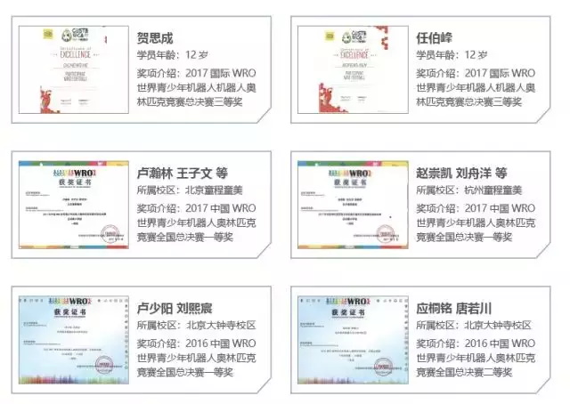 2016年WRO國際機器人大賽中,達內(nèi)童程童美學(xué)員榮獲北京區(qū)域賽冠軍/季軍;全國總決賽一等獎/二等獎。