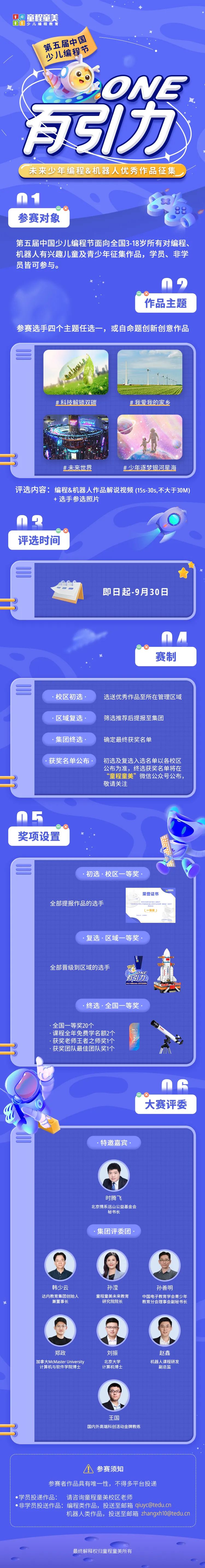 為了鼓勵更多的青少年在人工智能時代用編程創(chuàng)作的新方式展示新時代面貌,爭做擔(dān)當(dāng)民族復(fù)興大任的時代新人,童程童美將發(fā)起第五屆全國少兒編程節(jié),本次活動主題為“ONE有引力 · 未來少年編程&機(jī)器人優(yōu)秀作品創(chuàng)展季”,等著創(chuàng)意無窮的你來參加!ONE:展現(xiàn)每一位少年獨(dú)有的、唯一的創(chuàng)新力,展望孩子們通過科技素養(yǎng)構(gòu)建成長為頂流人才。