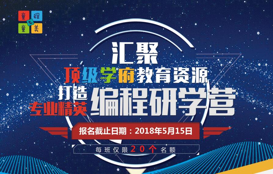 童程童美編程研學(xué)營開始啦!匯集頂尖學(xué)府教育資源,打造專業(yè)精英編程研學(xué)營!報(bào)名截止日期為2018年5月15日。每班僅限20個(gè)名額哦!?