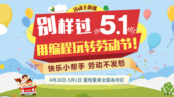 童程童美推出五一主題活動(dòng)課——用編程玩轉(zhuǎn)勞動(dòng)節(jié)!闖關(guān)贏童幣,趣味學(xué)編程,幸運(yùn)大抽獎(jiǎng),好禮送不停!活動(dòng)時(shí)間:2018年4月28日-5月1日,童程童美全國校區(qū)火爆開啟!