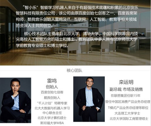 月28日,一款名為“智小樂”的兒童智能機器人在京東上發起了眾籌,這是一個成立于2015年的公司,去年9月開始了智能教育機器人項目,今年4月進入產品內測階段——這一切看起來都只是一個初創公司的正常信息。但引人注意的是,在這個產品眾籌的網站介紹上,其核心團隊介紹當中,創始人一欄,赫然是百度創始七劍客之一的雷鳴。